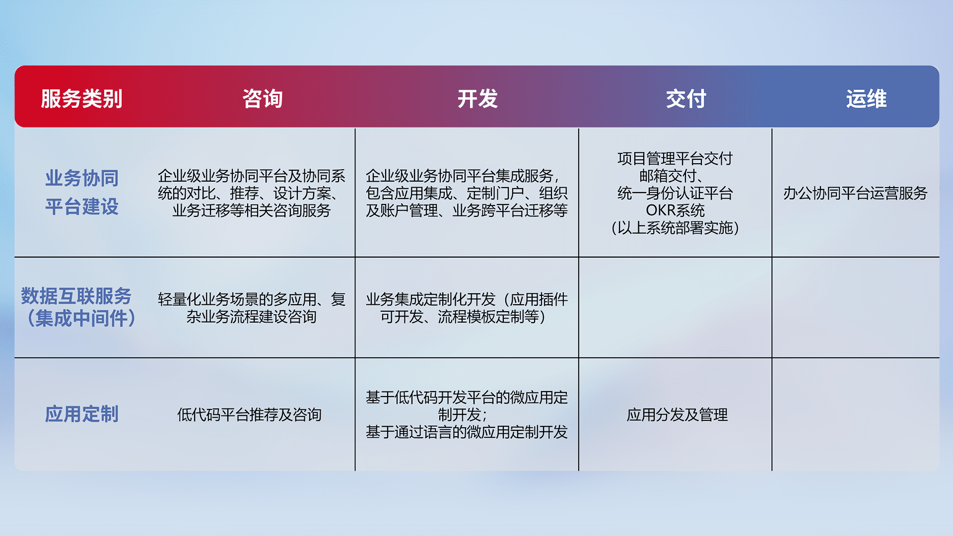 针对钉钉、、、企微、、IDaas等平台级产品提供产品的规划、、方案、、交付、、、定制化开发等服务,,,实现如统一协同办公、、、、智能客户服务、、、混合会议管理、、、智能数据查询、、等业务场景,,实现数字化转型。。。