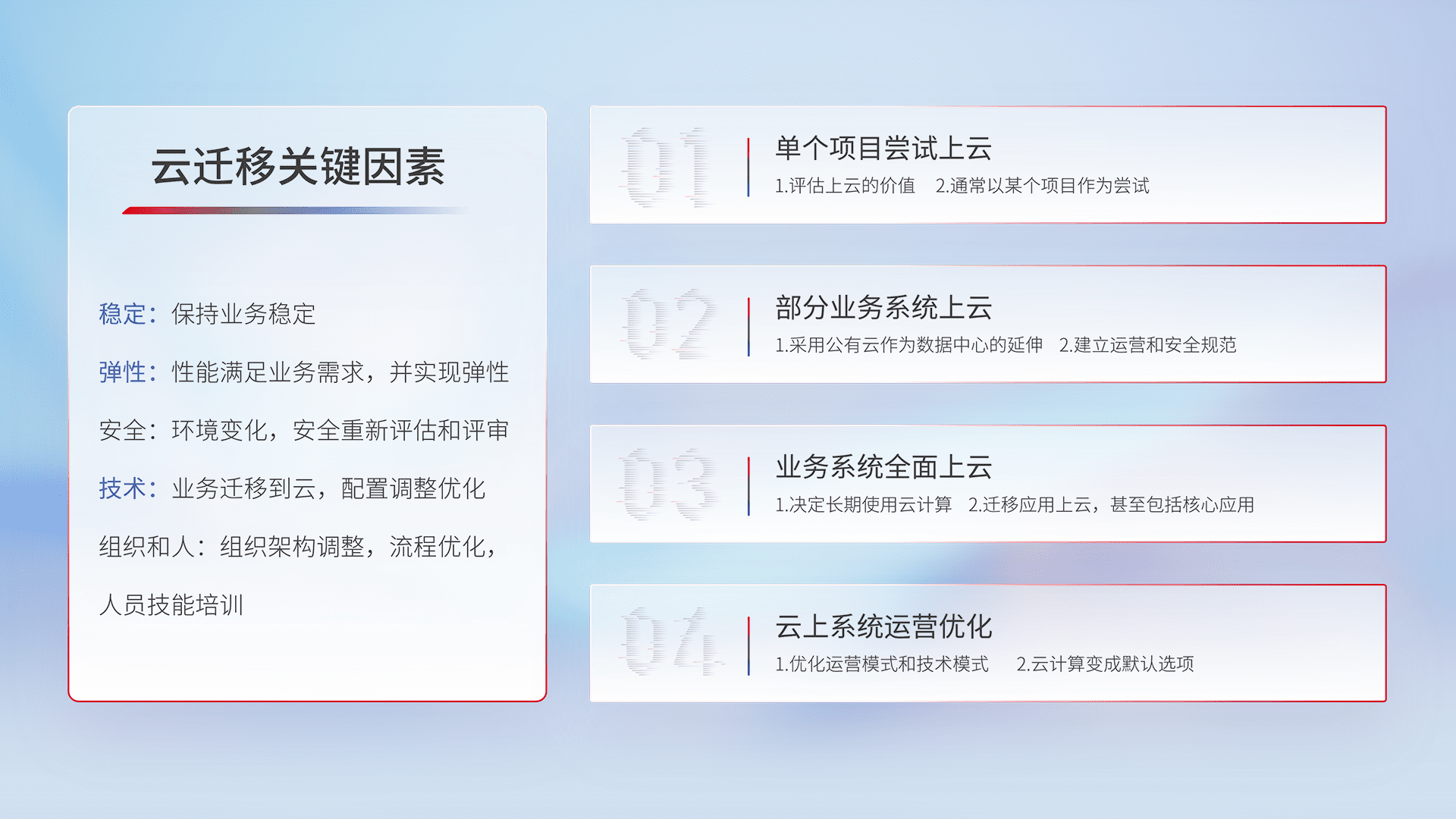 结合实际业务,,从规划设计、、云平台选型、、、云原生改造、、数据迁移、、、、集成交付,,迁移全过程为客户识别最佳上云路径,,,做好风险识别管理,,设计网络架构、、、身份权限、、、、安全审计合规、、、操作审计、、日志审计、、监控告警策略、、、多站点容灾设计等,,,,对云上基础设施进行整体规划,,提升IT治理水平,,,,以满足弹性、、、、高可用、、高性能的需求。。。